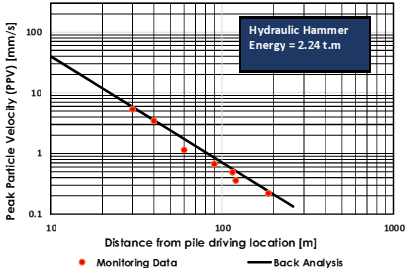 Abstract : Pile driving using hydraulic hammer will induce large vibration so that the effects of pile driving needs to be analyzed to avoid building damage and malfunction of the sensitive device. This paper discusses a case study in South Sumatera, Indonesia regarding the effect of pile driving on a sensitive gas plant instrument and building surrounding the project area. The effect of vibration due to pile driving is calculated using empirical formulas (Attewel & Farmer, 1973 and J.M. Ko et al, 1990). However, there is correction factor of the empirical formulas that are dependent to soil types. Continuous monitoring has been carried out in the project area by using geophone sensors to measure vibrations and PDA (Pile Driving Analyzer) to measure actual energy of driving. Peak particle velocity (PPV) from empirical formulas are approaching PPV value from monitoring test at the same energy of pile driving. The results will be used to back analyse to modify the correction factor of the empirical formulas.