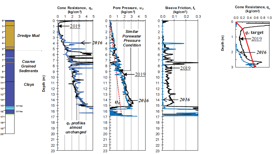 Abstract : The use of CPTu in soft soils are widespread. Usually, the CPTu tip resistance measures soft soils response as soil resistance as well as pore water pressure due to penetration of the cone during insertion into the soils. However, when CPTu is conducted in very soft soils and ultra-soft soils, the soil resistance is very low, and pore pressure dominates the proportion of the resistance. Hence CPTu is the best tool to investigate the behavior of soft soils as well as ultra-soft soils. Before penetration testing, the initial excess pore pressure has not entirely diminished. In this case, the measured excess pore water pressure shall be interpreted as combined existing pore water pressure (hydrostatic and residual excess pore pressure) and the additional excess pore water pressure due to cone penetration. This paper represents research results of CPTu in reclaimed soils and deposited dredge mud, which was dumped in the area in 2016. Additional data were obtained recently in 2019. However, the degree of consolidation of soft soils practically did not change, but the dredge mud deposit slightly change.