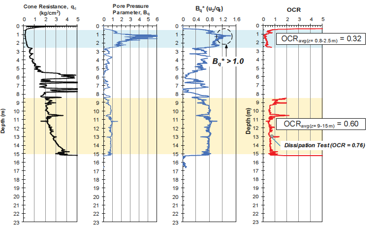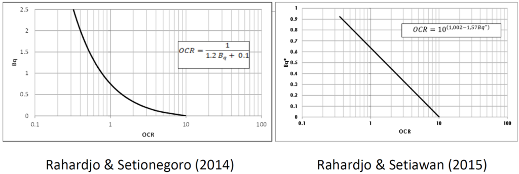 silts and established a correlation between the pore pressure ratio (Bq) and the overconsolidation ratio (OCR) or degree of consolidation. Subsequently, Rahardjo (2015) modifying this relationship by removing outliers and proposed the relationship between Bq and OCR. OCR less than unity means the degree of consolidation, and higher than one means Overconsolidation Ratio (OCR). It should be noted that the available data was at the lowest degree of consolidation of 30%.