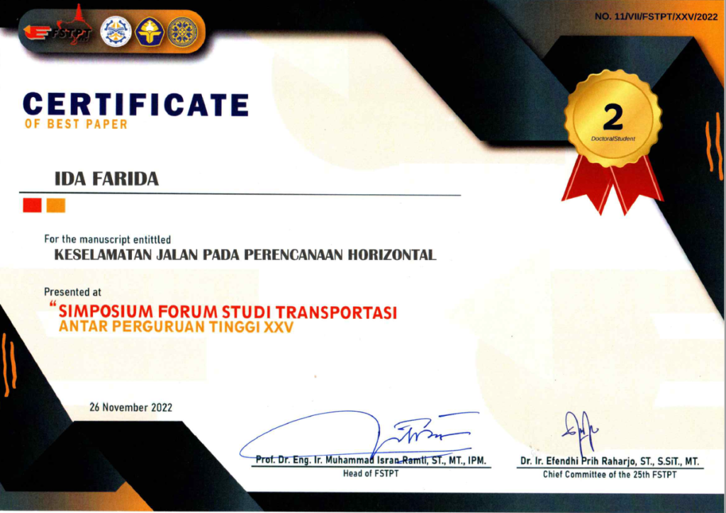 Dua mahasiswa Program Doktor Teknik Sipil UNPAR yang berada dibawah bimbingan Prof. Ir. Wimpy Santosa (Promotor), Ir., M.Eng., MSCE., Ph.D., IPU dan Prof. Ir. Anastasia Caroline Sutandi, S.T., M.T., Ph.D., IPU (Co Promotor) yakni Ida Farida dan Bertho O. S. berhasil menjadi juara 2 dan 3 untuk best presentation paper kategori mahasiswa doktor di Simposium Forum Studi Transportasi Antar Perguruan Tinggi atau FSTPT XXV 2022.