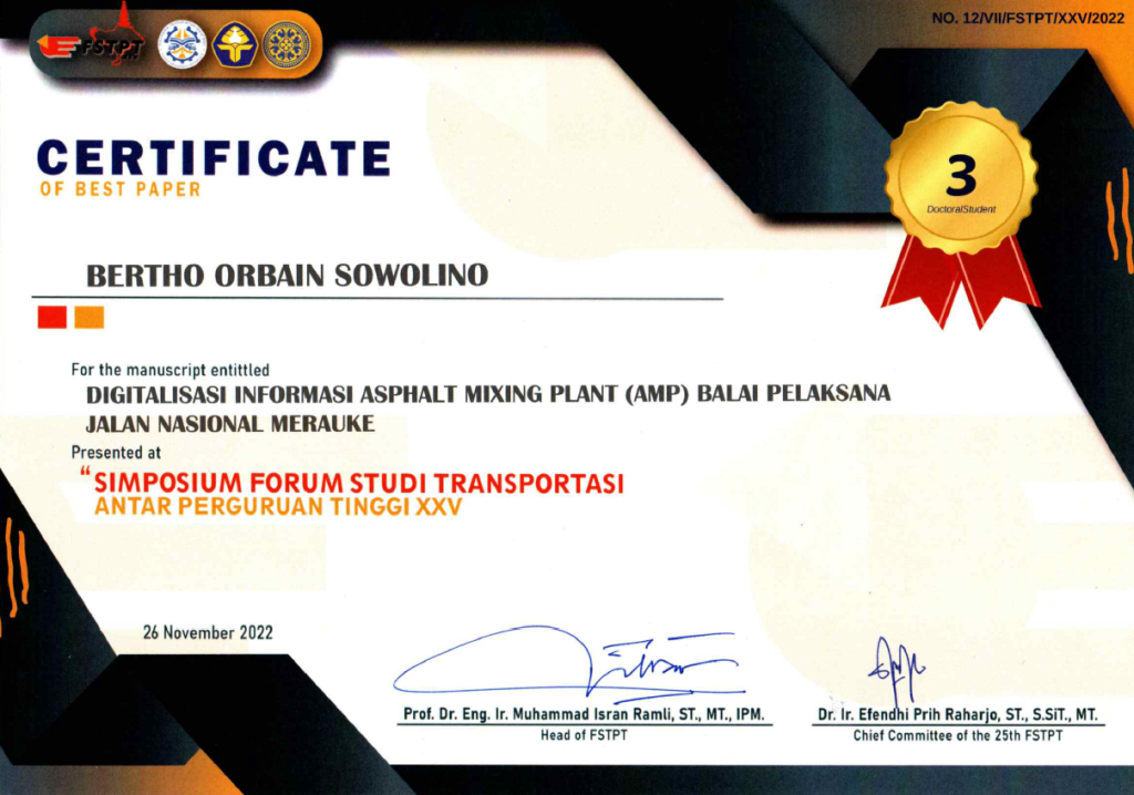 Ida Farida berhasil menjadi juara 2 dengan manuscript yang berjudul Keselamatan Jalan Pada Perencanaan Horizontal sedangkan Bertho O. S. berhasil menjadi juara 3 dengan manuscript yang berjudul Digitalisasi informasi Asphalt Mixing Plant (AMP) Balai Pelaksana Jalan Nasional Merauke.