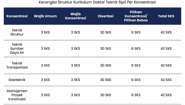 Struktur kurikulum program Doktor teknik sipil UNPAR terdiri dari mata kuliah wajib umum, mata kuliah wajib konsentrasi, mata kuliah pilihan konsentrasi dan mata kuliah pilihan bebas, dengan definisi: